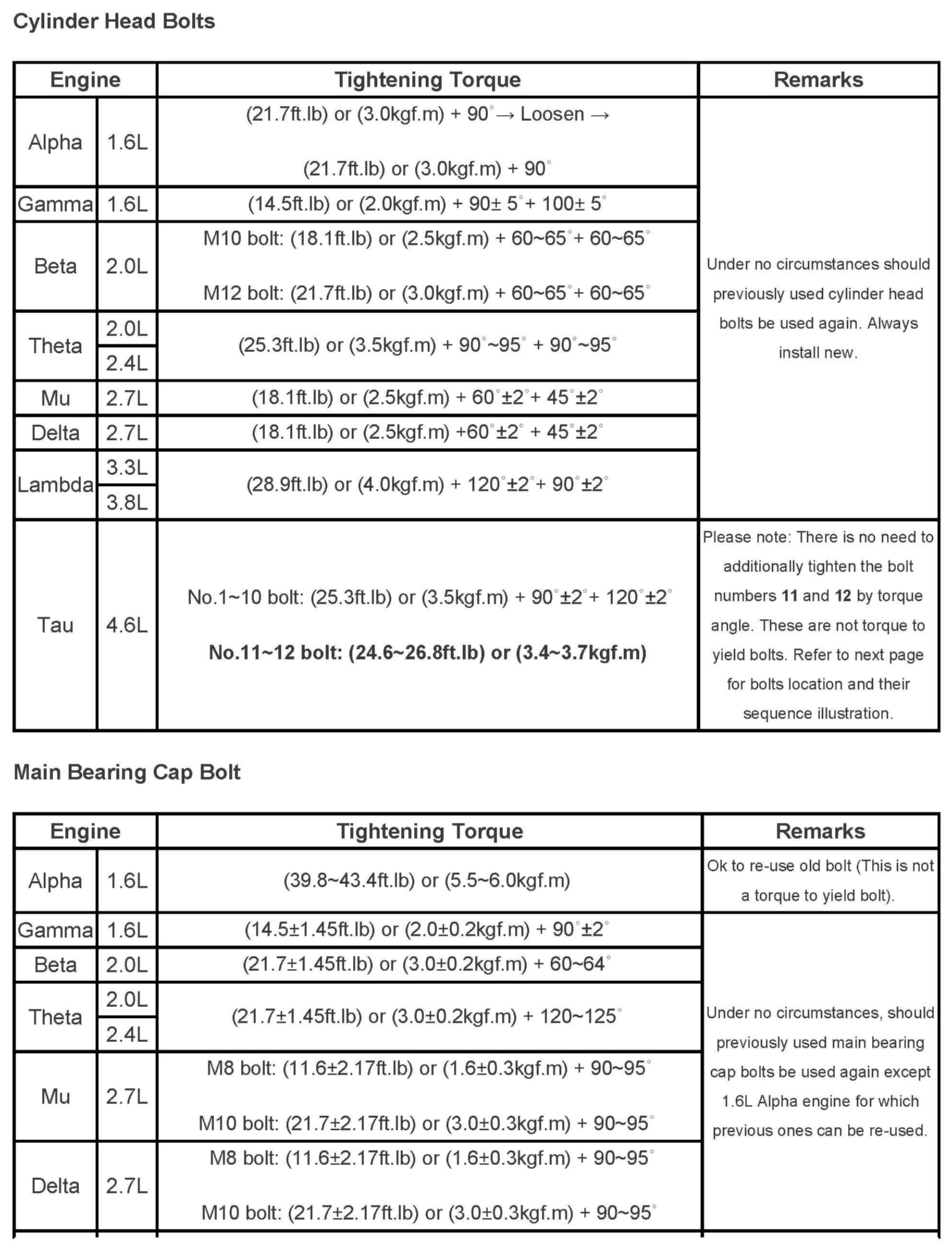 This bulletin provides information on torque specifications for cylinder head, crankshaft, main & rod bearing cap bolts by means of torque-angle method, using a torque wrench and torque angle gauge. Information is provided for the models shown above.