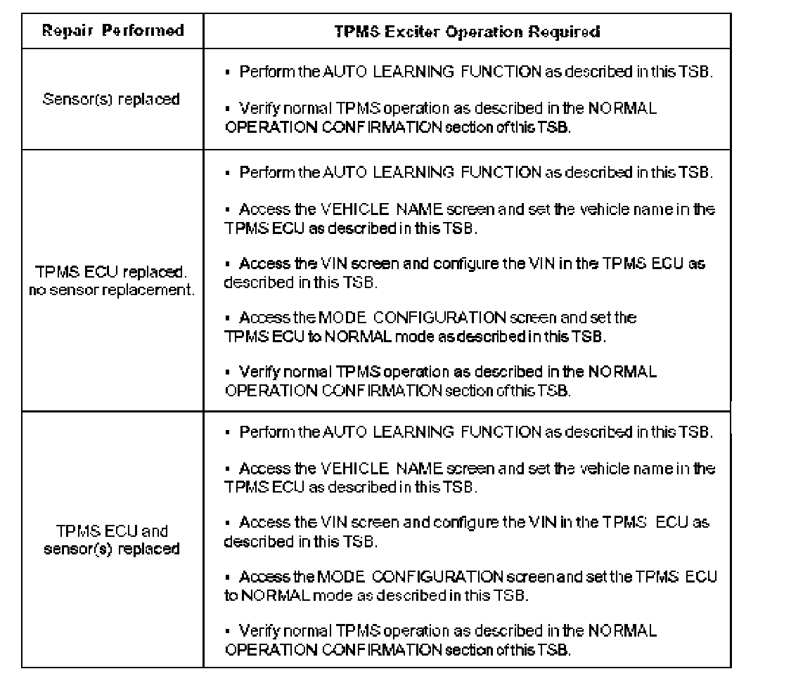 Refer to the table for TPMS Exciter operations that are required based upon the type of repair performed.