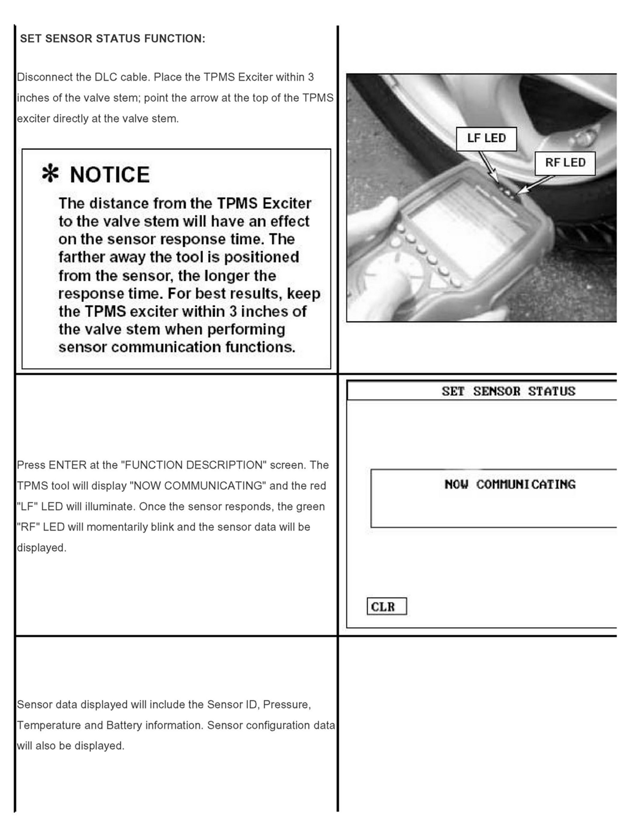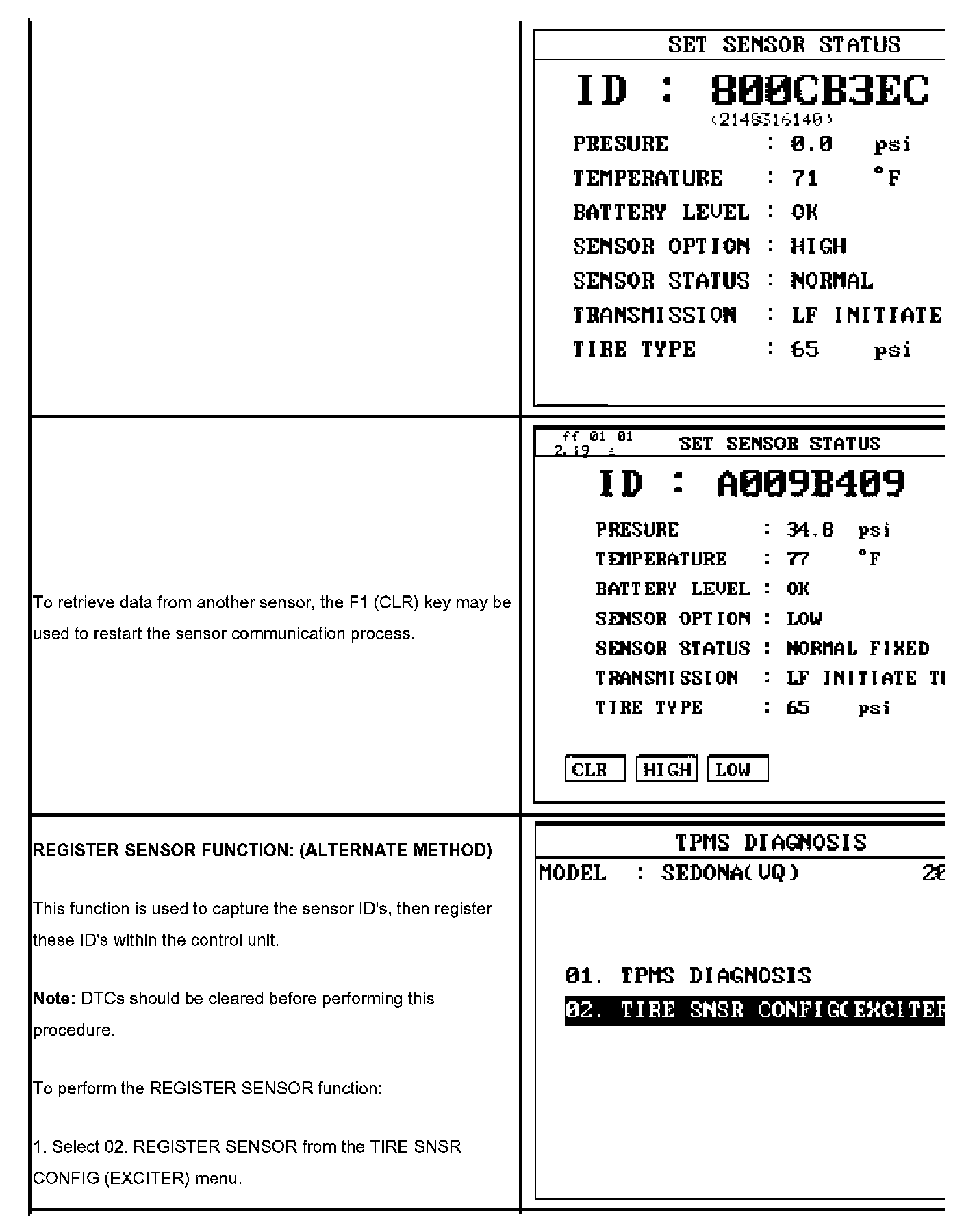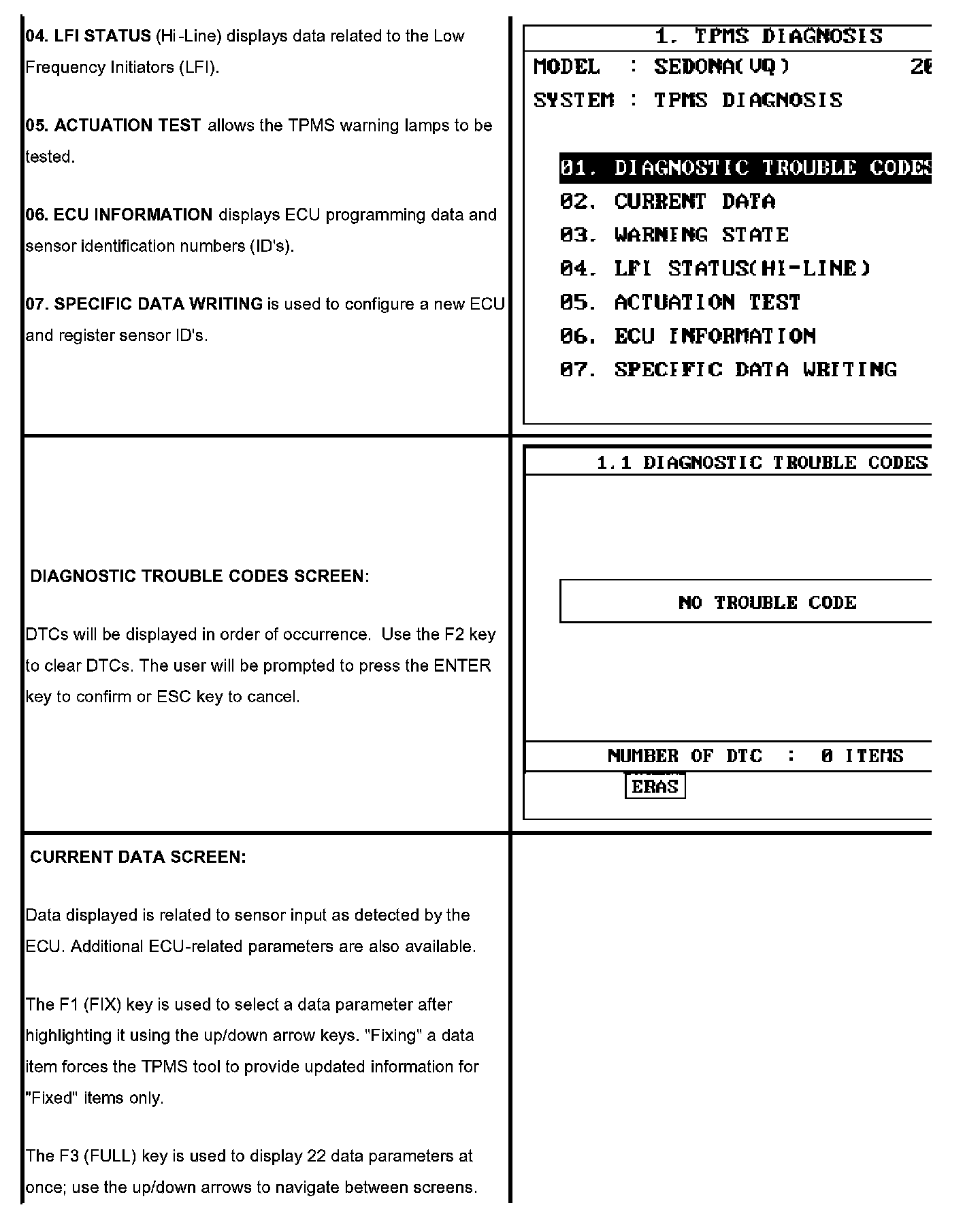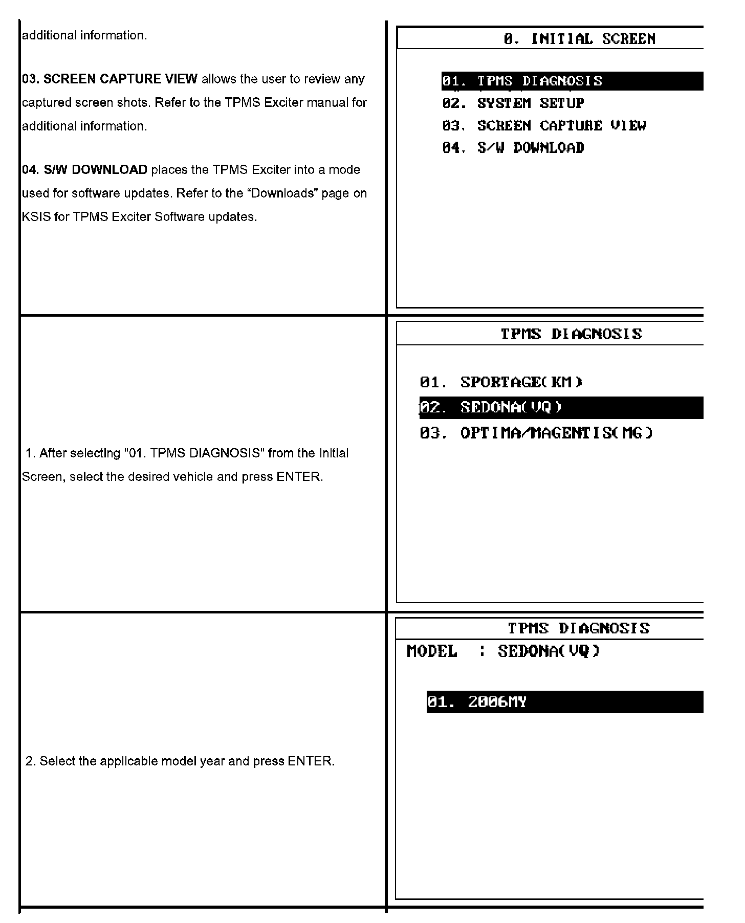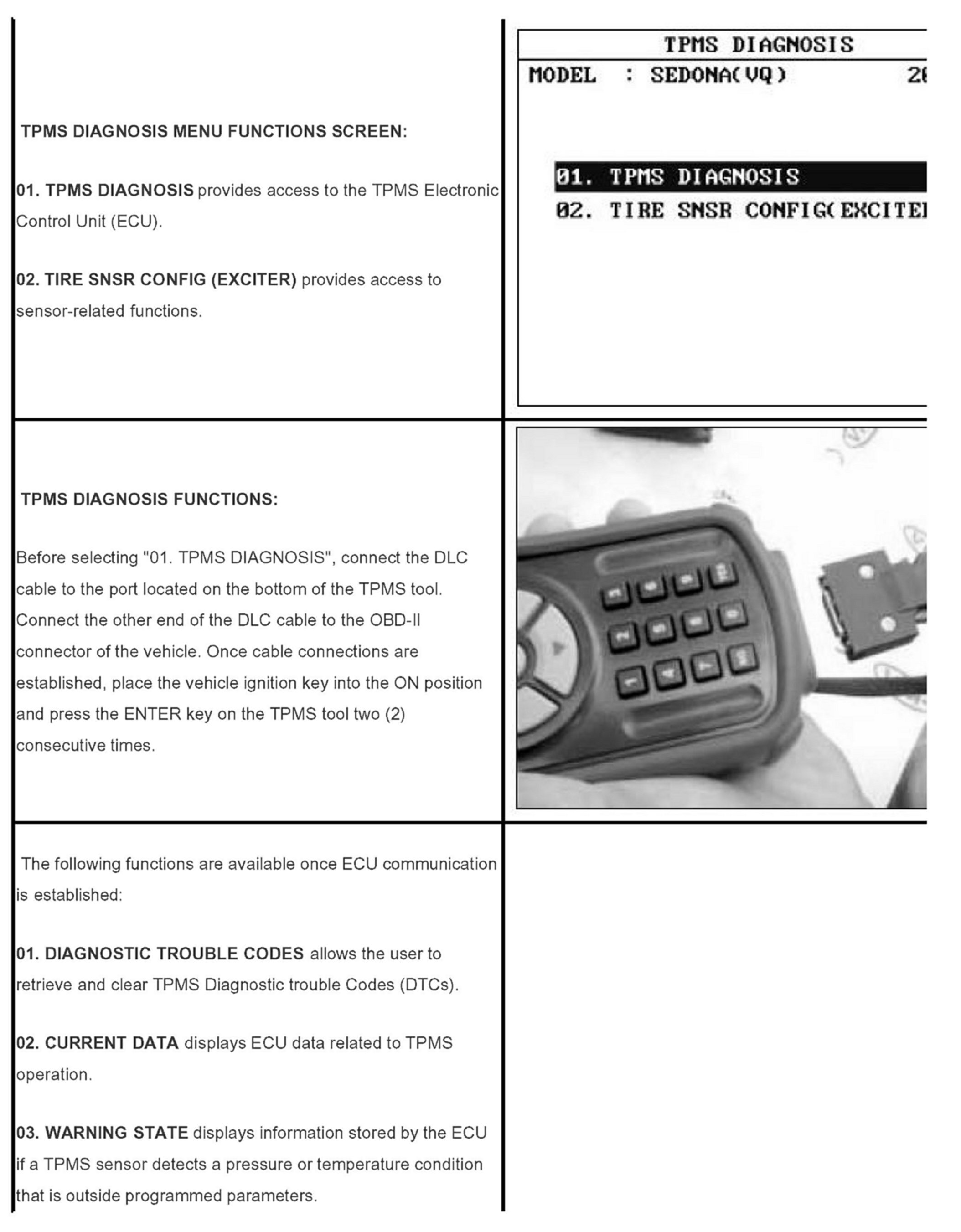 This bulletin provides information relating to the use of a Tire Pressure Monitoring System (TPMS) Exciter on the 2006 The 2006 Sedona is equipped with a Tire Pressure Monitoring System (TPMS) and requires a special tool for sensor communication and Electronic Control Unit (ECU) programming in addition to enhanced diagnostic data access. Additional information regarding tool usage is included in the manual supplied with the tool.