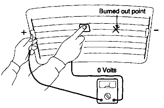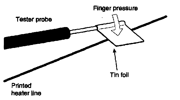 CAUTION: Wrap tin foil amend the end of the voltmeter test lead to prevent damaging the heater line. Apply finger pressure on the tin foil, moving the tin foil along the grid line to check for open circuits.