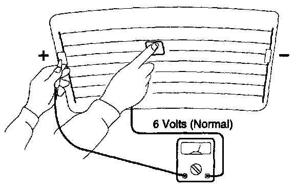 1. Turn on the defogger switch and use a voltmeter to measure the voltage of each heater line at the glass center point. If a voltage of approximately 6 V is indicated by the voltmeter, the heater line of the rear window is considered satisfactory.