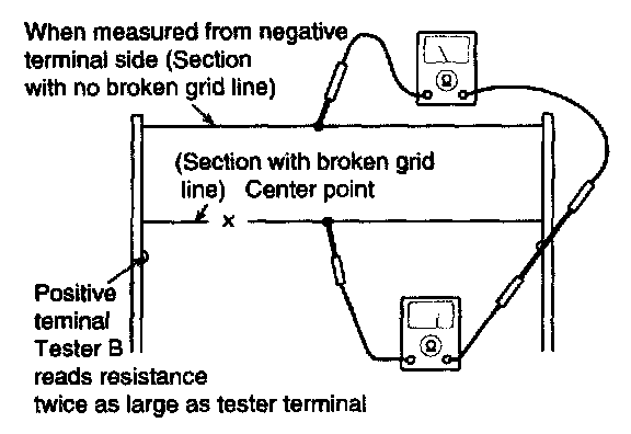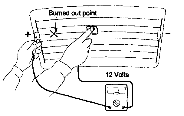 5. Use an ohmmeter to measure the resistance of each heater line between a terminal and the center of a grid line, and between the same terminal and the center of one adjacent heater line. The section with a broken heater line will have a resistance twice as that in other sections. In the affected section, move the test lead to a position where the resistance sharply changes.
