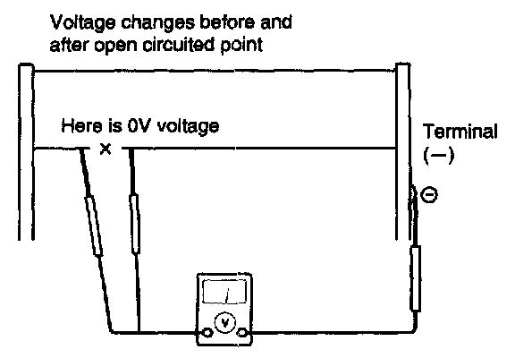 4. To check for open circuits, slowly move the test lead in the direction that the open circuit seems to exist. Try to find a point where a voltage is generated or changes to 0 V. The point where the voltage has changed is the open-circuit point.