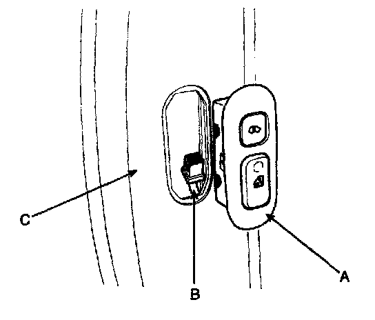 2. Disconnect the connector (B) after removing the sliding power window switch (A) from the B pillar trim (C).