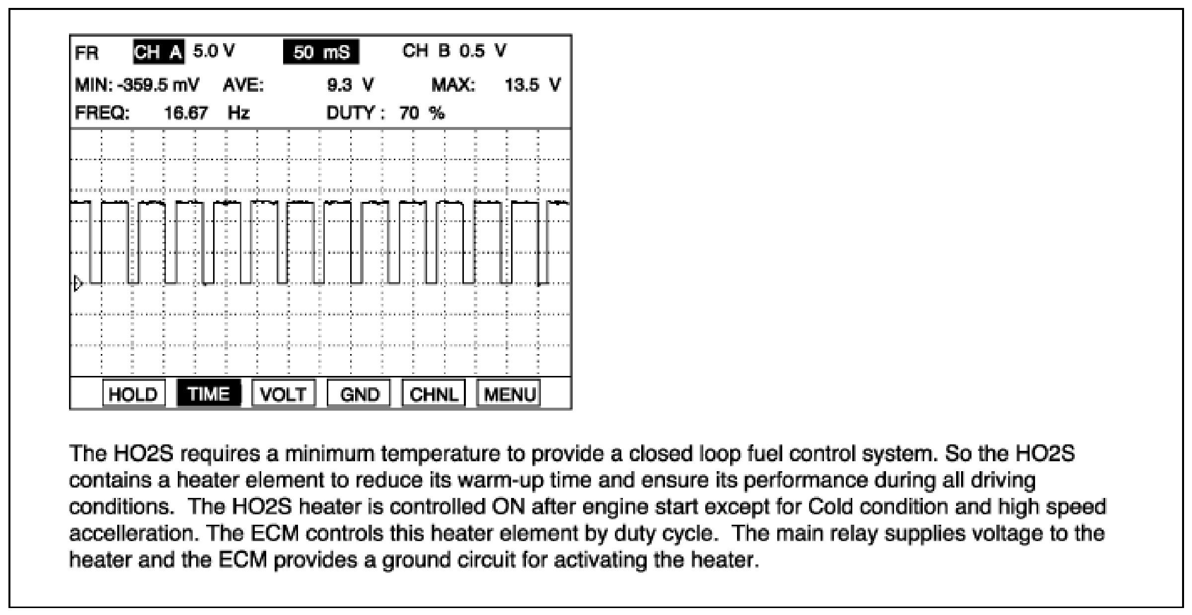 The ECM controls this heater element by duty cycle. The main relay supplies voltage to the heater and the ECM provides a ground circuit for activating the heater.