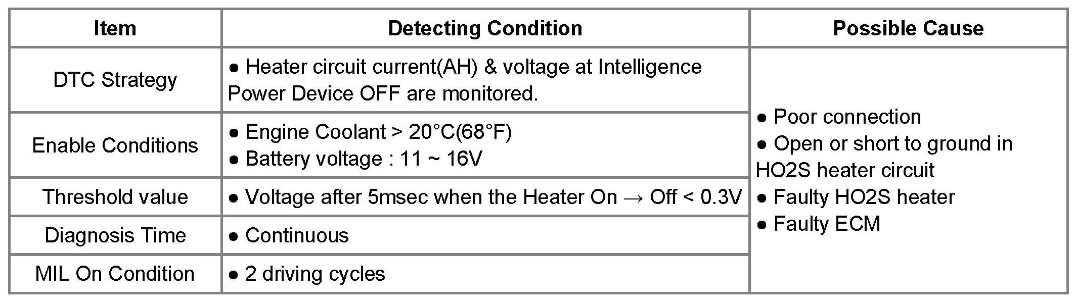 If the voltage of HO2S heater is lower than threshold value after the heater shifts from "ON" to "OFF", the ECM determines that a fault exists and a DTC is stored.