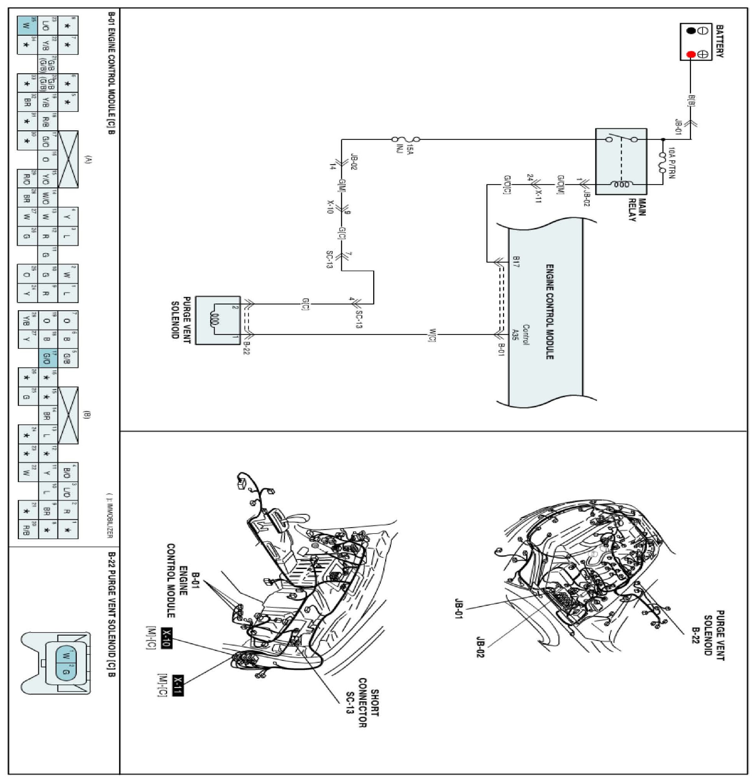 The evaporative emissions system prevents hydrocarbon (HC) vapors from the fuel tank from escaping into the atmosphere where they could form photochemical smog. Gasoline vapors are collected in the charcoal canister. The Canister Close Valve (CCV) closes off the air inlet into the canister for leak detection of the evaporative emission system. The CCV also prevents fuel vapors from escaping from the canister. When the engine purges the HC vapors from the canister, the clean air comes into the canister through the canister air-filter and the CCV.