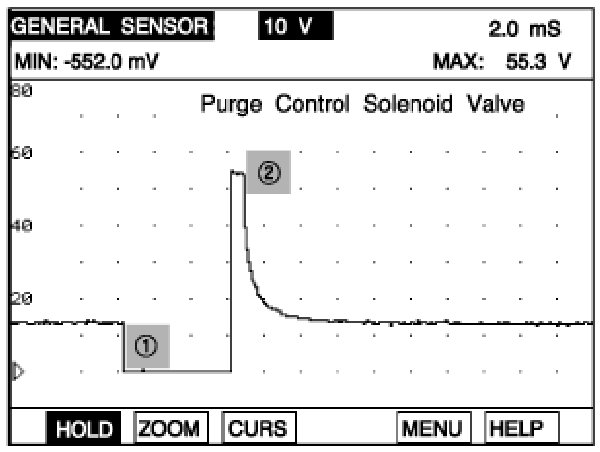 (5) Monitor the CCV signal waveform and verify that the ground voltage is less than approx. 0.3V (1) and the surge voltage (2) is between 40 V and 60 V.