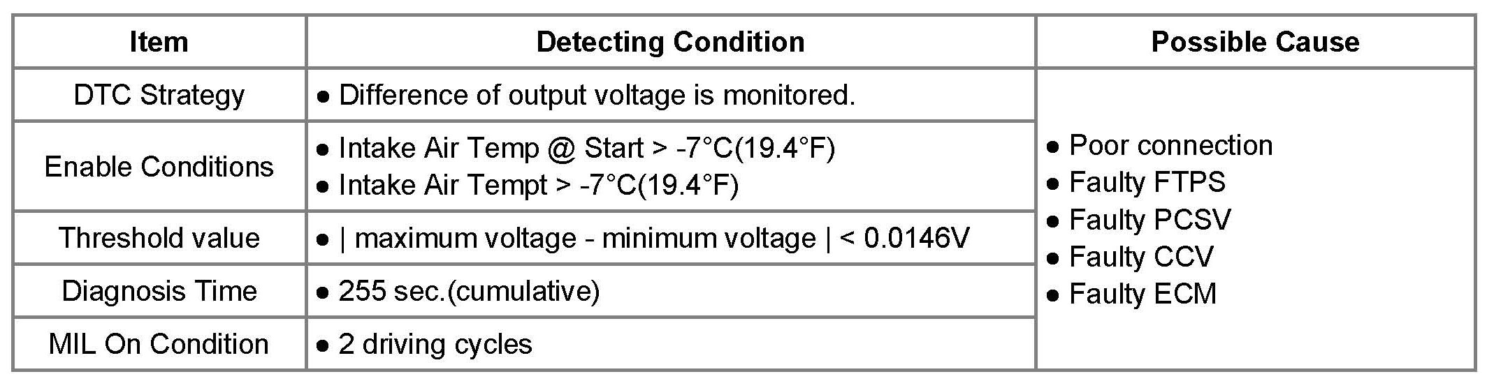 If the voltage difference between maximum and minimum of fuel tank pressures signal is out of the threshold value, the ECM determines that a fault exists and a DTC is stored.