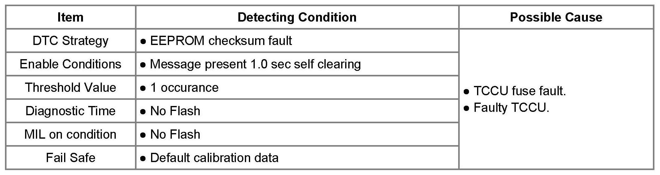 TCCU distribute driving force of front and rear wheels automatically by selecting of mode switch. It controls output element to distribute driving force according to the road and driving condition. For the judgement of system failure,it has self-diagnostic function. This trouble code is related to TCCU and set when EEPROM is checksum fault.