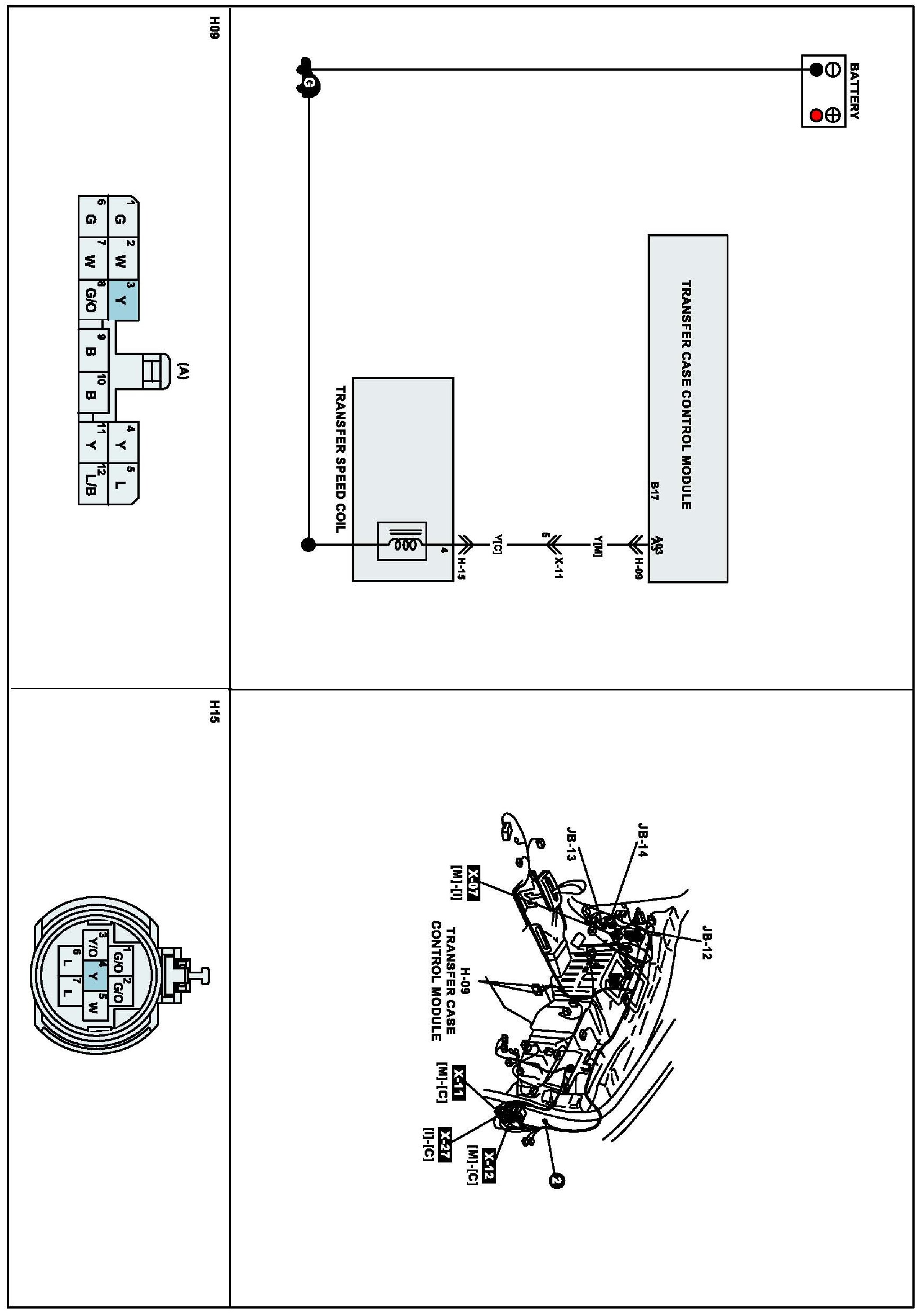 3. Measure resistance between terminal 4 of TRANSFER SPEED COIL harness connector H-15 and terminal A3 of TCCU harness connector A .