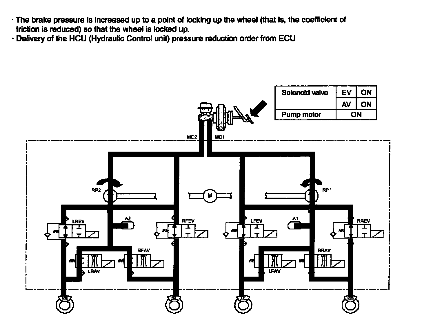 ^ The brake liquid is excessively extracted in decreasing pressure mode or the coefficient of the friction between the wheel and road surface is increased so that wheel liquid pressure is increased.
