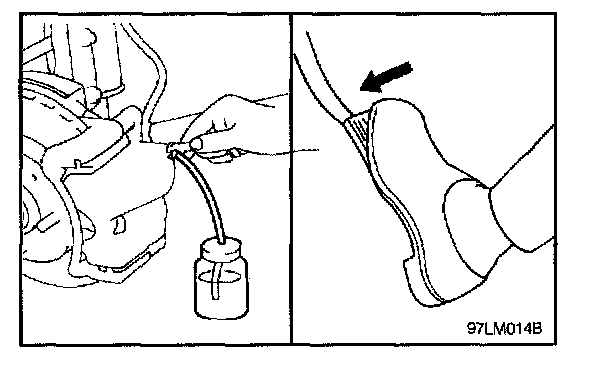 2. Connect a vinyl tube to the wheel cylinder bleeder screw and insert the other end of the tube in a container of brake fluid which is half full.