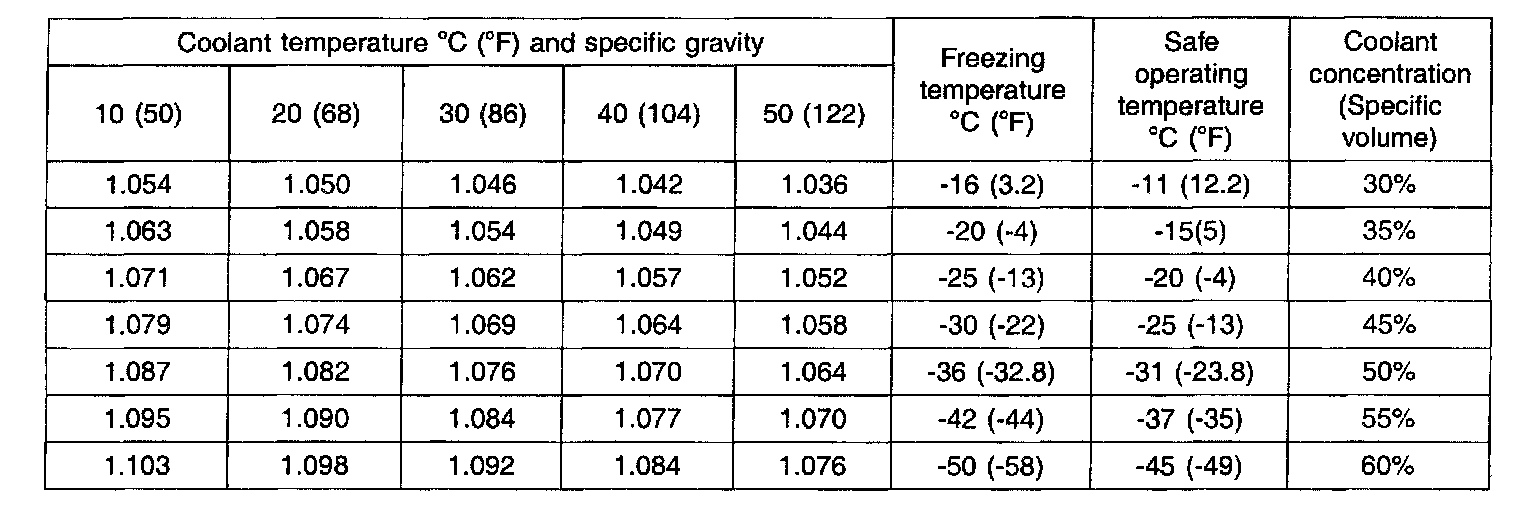 RELATION BETWEEN COOLANT CONCENTRATION AND SPECIFIC GRAVITY