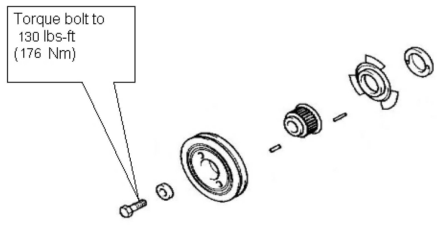 KMA has received some questions regarding the proper torquing of the Crankshaft Pulley Bolt. The bolt and washer should be replaced every time the bolt and washer are removed and SHOULD NOT BE RE-USED. This bolt and washer must be torqued to 130 lbs. ft. (176 Nm) by hand using a properly calibrated torque wrench. The flywheel must be held stationary while the bolt is being torqued. Under NO circumstances should the bolt be installed using an air impact gun!