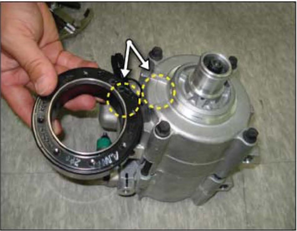 8. When installing the new field coil on the compressor assembly, be sure to align the field coil groove and compressor housing mating mark, install the field coil snap ring, if equipped.