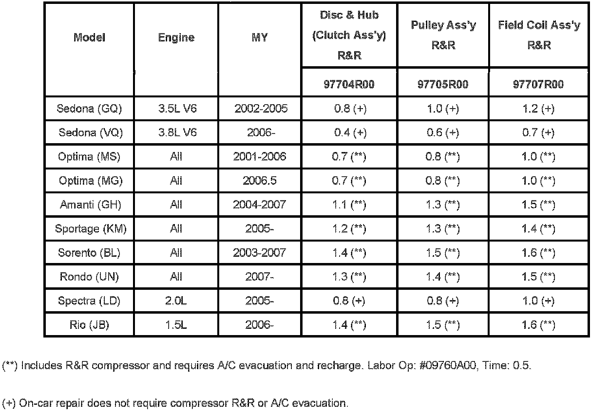 This service bulletin provides information regarding A/C Compressor Disc & Hub / Pulley / Field Coil Assembly inspection an replacement on all current Kia models. During routine diagnostic procedures to isolate air conditioning compressor faults such as open field coil circuits and noises related to the disc and hub assembly, previous repairs required air conditioning compressor replacement. Kia has made the Disc & Hub / Pulley / Field Coil available as serviceable items. No other repair or service should be made to the air conditioning compressor assembly outside of these replacement/serviceable items.