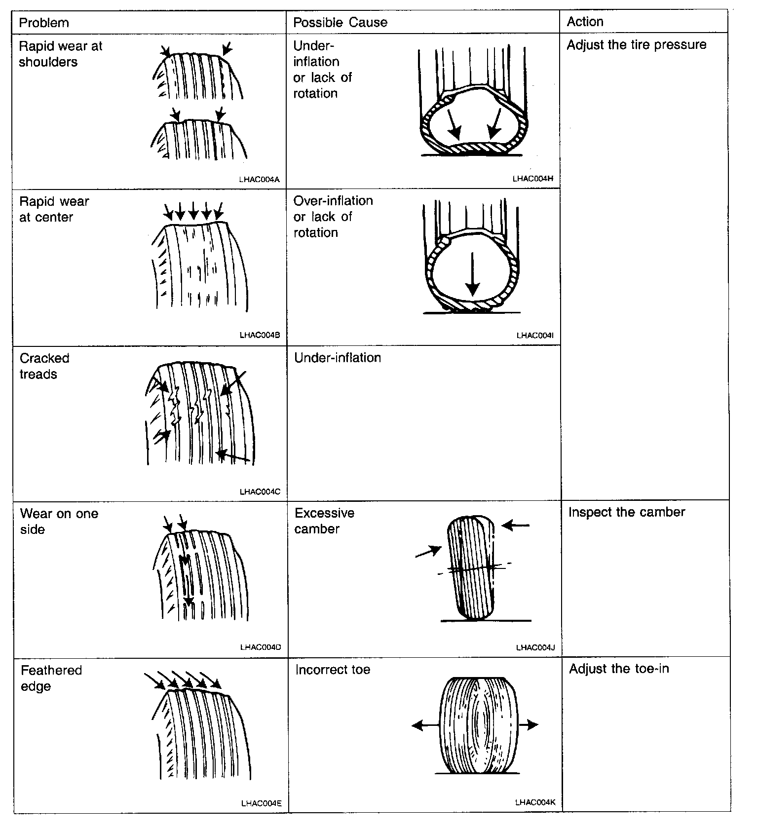 DIAGNOSIS (TIRES/WHEELS)The wear patterns or damage visible on the tires are symptoms of problems (faults) within the tire, wheel or suspension system of the vehicle. Other faults are identifiable by symptoms noted during driving the vehicle, or during inspection of the vehicle.