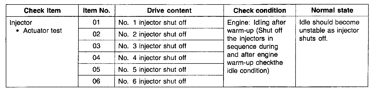 3. If there is any cylinder whose idle state remains unchanged when the fuel injectors are cut one after another during idling, check for the following items about that a cylinder.