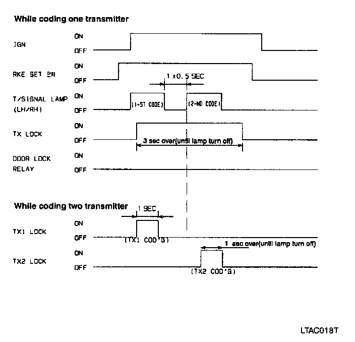1. To store transmitter code, first apply the battery voltage to terminal "6" of DLC (Data Link Connector) and then operates as shown in the illustration.