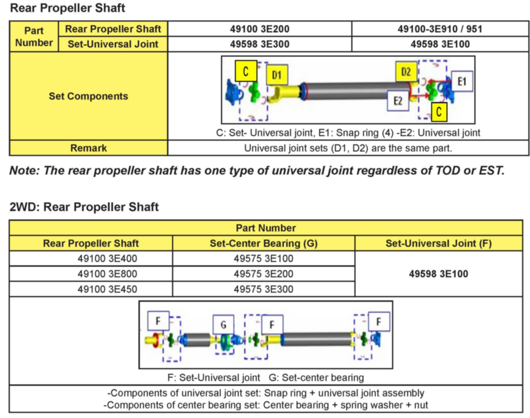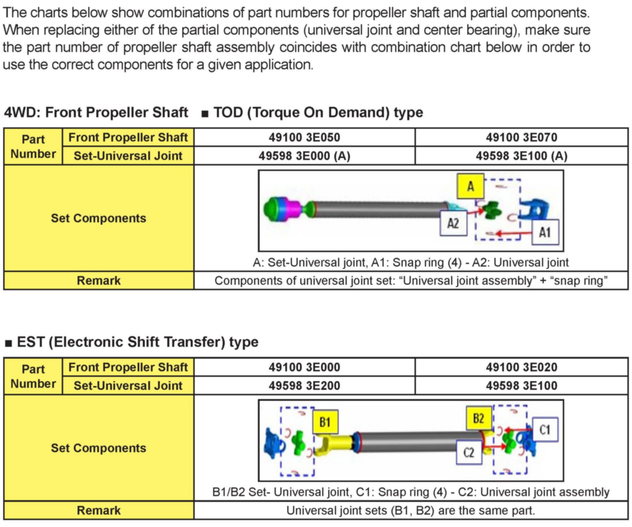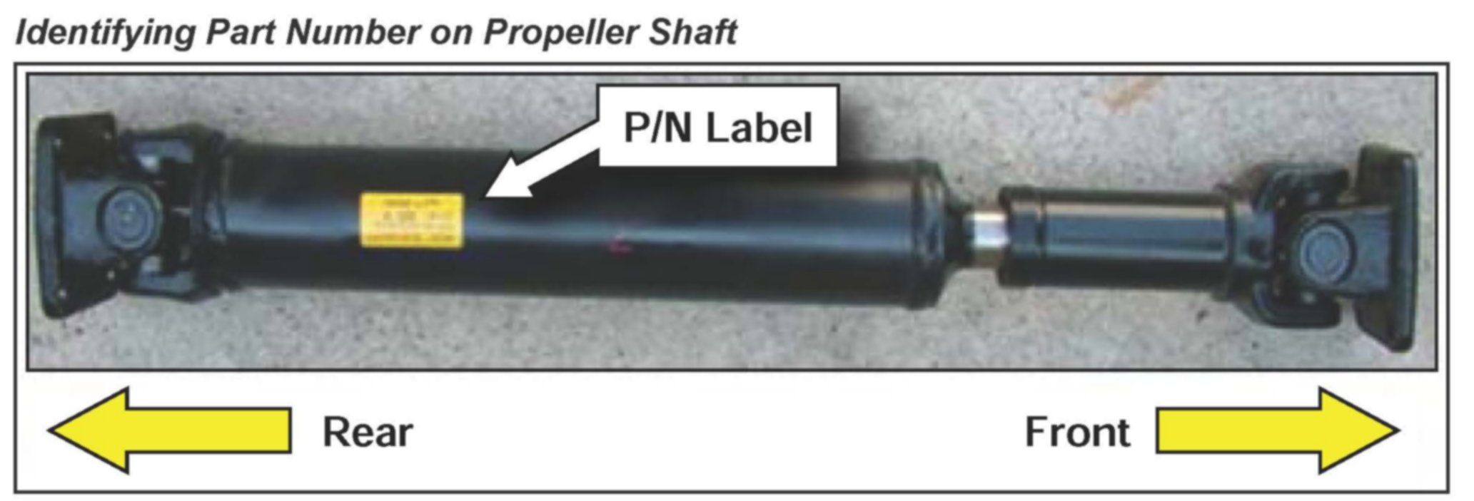 Before replacing center bearing and/or universal joints, make sure to check the part number on the propeller shaft assembly by identifying the part number label attached on the rear of the shaft. This will ensure that the correct parts are used.