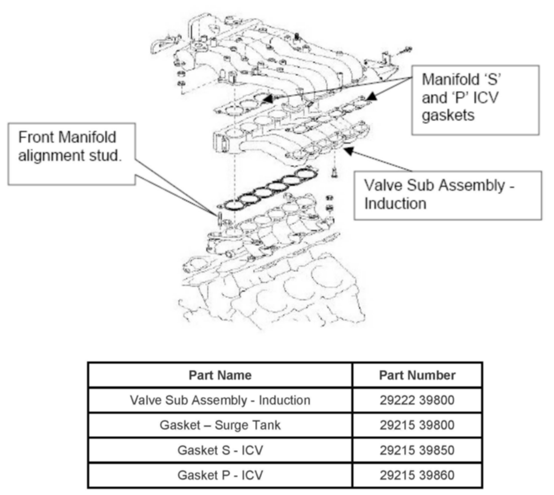 14. Position intake gasket P/N 29215 39800 properly and install new lower and upper manifold as an assembly. Before installing intake manifold bolts, check alignment of intake gasket to prevent vacuum leaks and excessive fuel trim concerns.