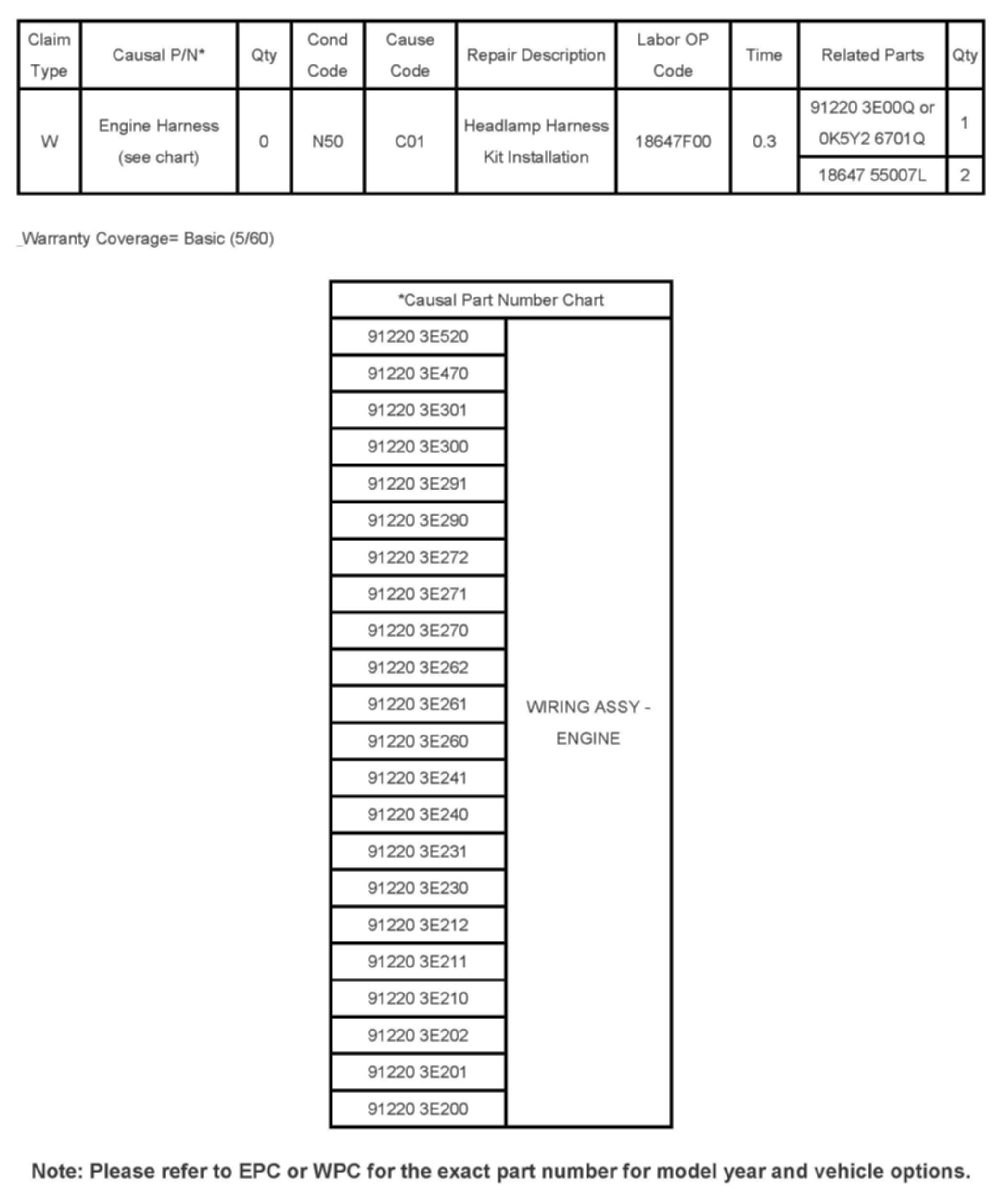 Warranty Information/Causal Part Number Chart