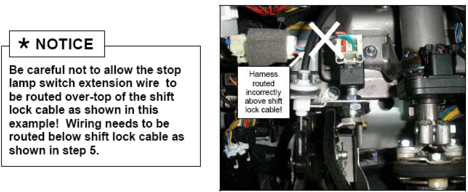 5. Stop lamp switch extension wiring is shown here properly routed underneath the shift lock cable.