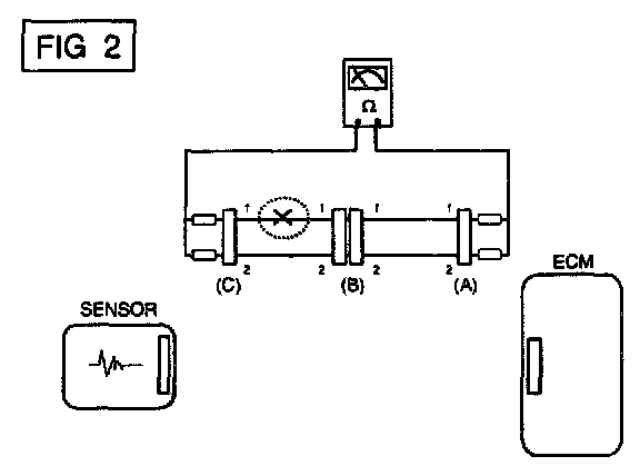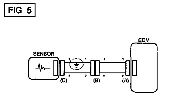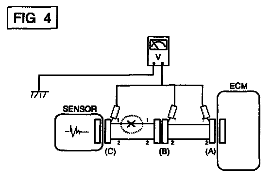a. With each connector still connected, measure the voltage between the chassis ground and terminal 1 of each connectors (A), (B) and (C) as shown in [FIG. 4].