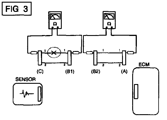 b. Disconnect connector (B), and measure for resistance between connector (C) and (B1) and between (B2) and (A) as shown in [FIG. 3].