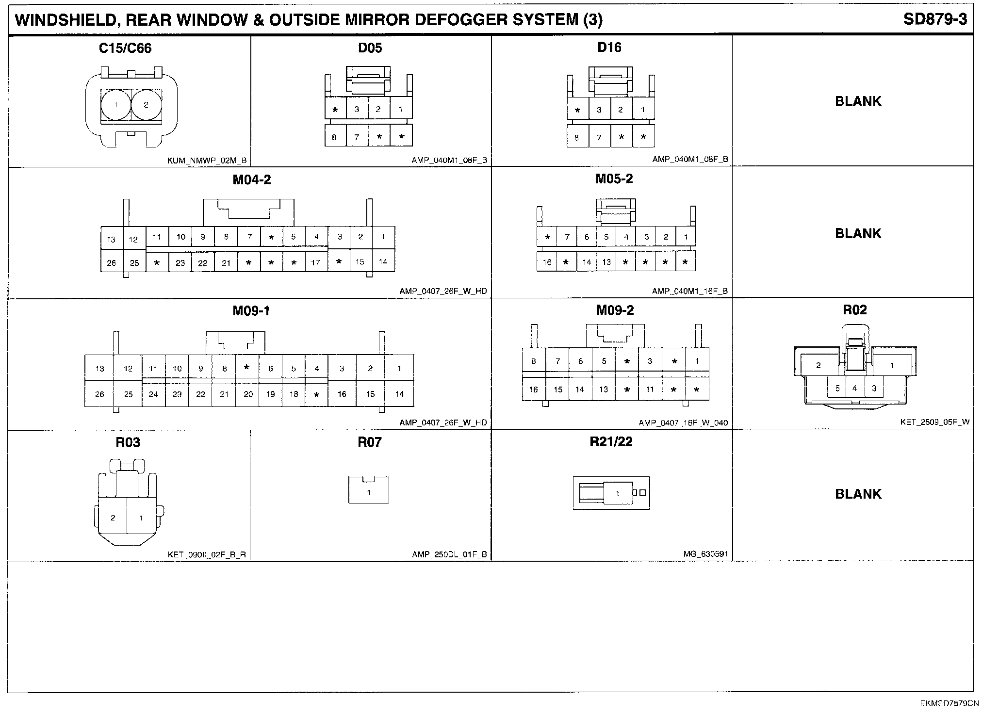 Windshield, Rear Window & Outside Mirror Defogger System Connector Pin Outs: