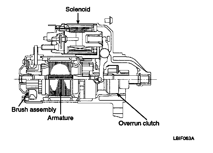 The contacts close and the starter motor cranks. In order to prevent damage caused by excessive rotation of the starter armature when the engine starts, the clutch pinion gear overruns.
