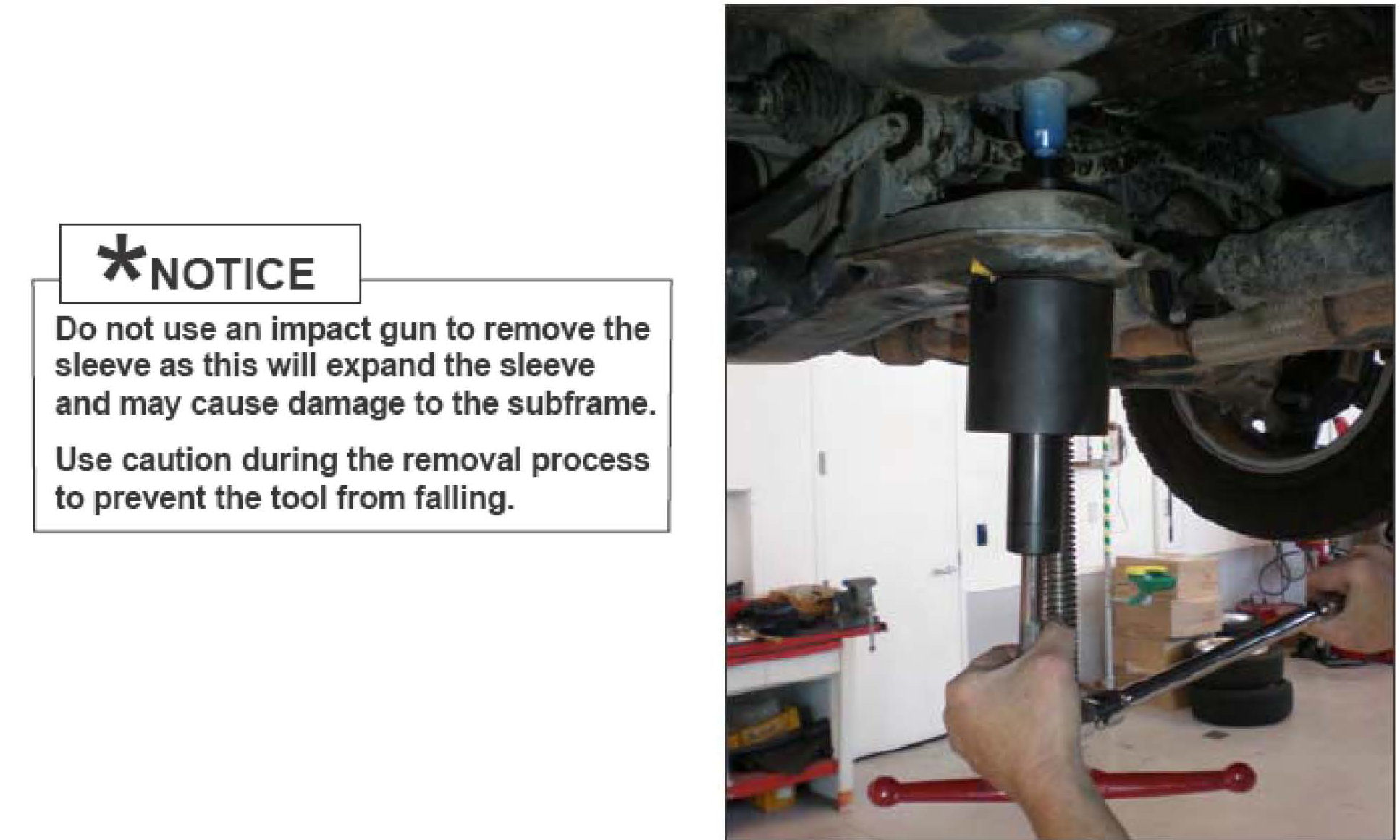and installed without removing the sub frame from the vehicle. The subframe will be lowered to access the top of the bushing