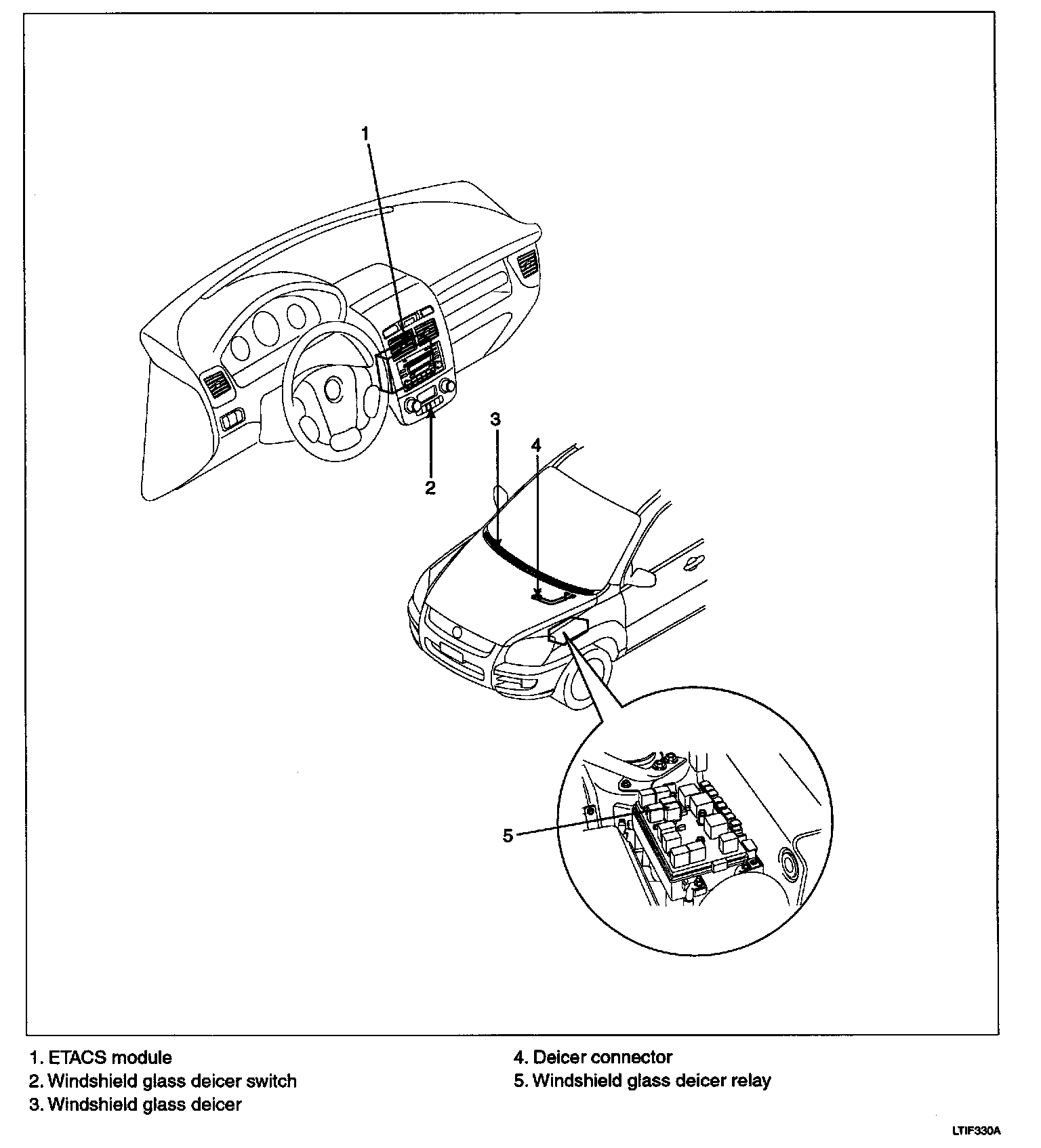 Windshield glass deicer system prevent windshield wiper from freezing in the winter season. It consists of deicer in the lower part of windshield glass, switch and relay. ETACS module receives an input signal from the deicer switch, then controls relay. Operating condition is the same that of rear window defogger system. Since the alternator "L" is switched ON, if the deicer switch is ON, then deicer output is ON for 20 minutes.