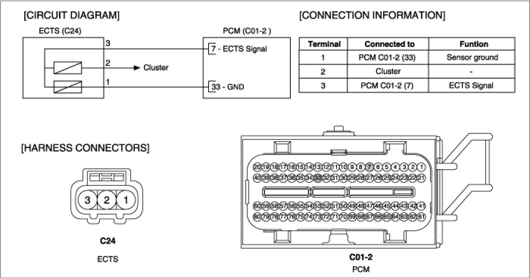 Engine Coolant Temperature Sensor (ECTS) is located in the engine coolant passage of the cylinder head for detecting the engine coolant temperature. The ECTS uses a thermistor whose resistance changes with the temperature. The electrical resistance of the ECTS decreases as the temperature increases, and increases as the temperature decreases. The reference 5 V in the PCM is supplied to the ECTS via a resistor in the PCM.That is, the resistor in the PCM and the thermistor in the ECTS are connected in series. When the resistance value of the thermistor in the ECTS changes according to the engine coolant temperature, the output voltage also changes. During cold engine operation the PCM increases the fuel injection duration and controls the ignition timing using the information of engine coolant temperature to avoid engine stalling and improve drivability.