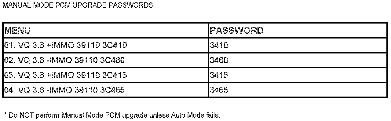 DO NOT attempt to perform a Manual Mode PCM upgrade unless Auto Mode fails. Always follow the instructions given on the GDS tool in either Auto or Manual mode. See table above for Manual Mode passwords.