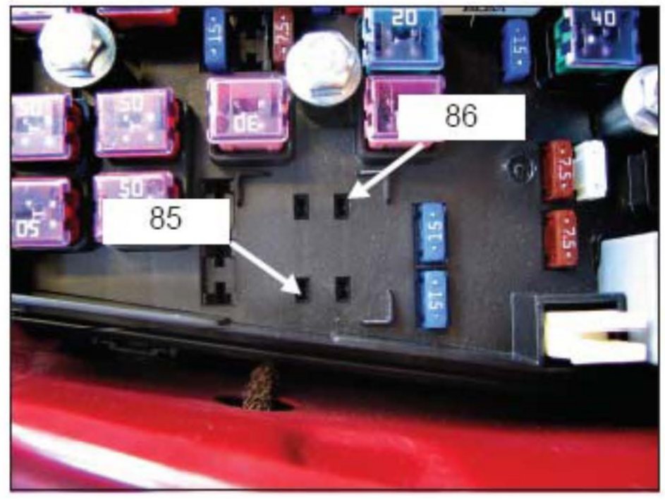 7. Connect (clip) the negative (black) lead of a DVOM to terminal 85 of the removed Start Relay (red T-Connector wire).