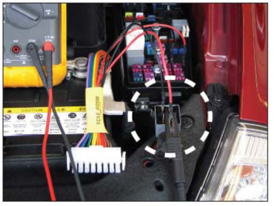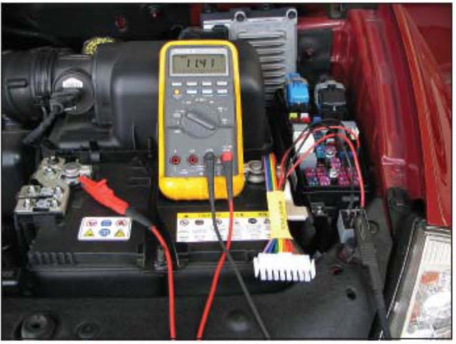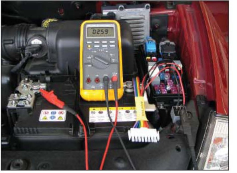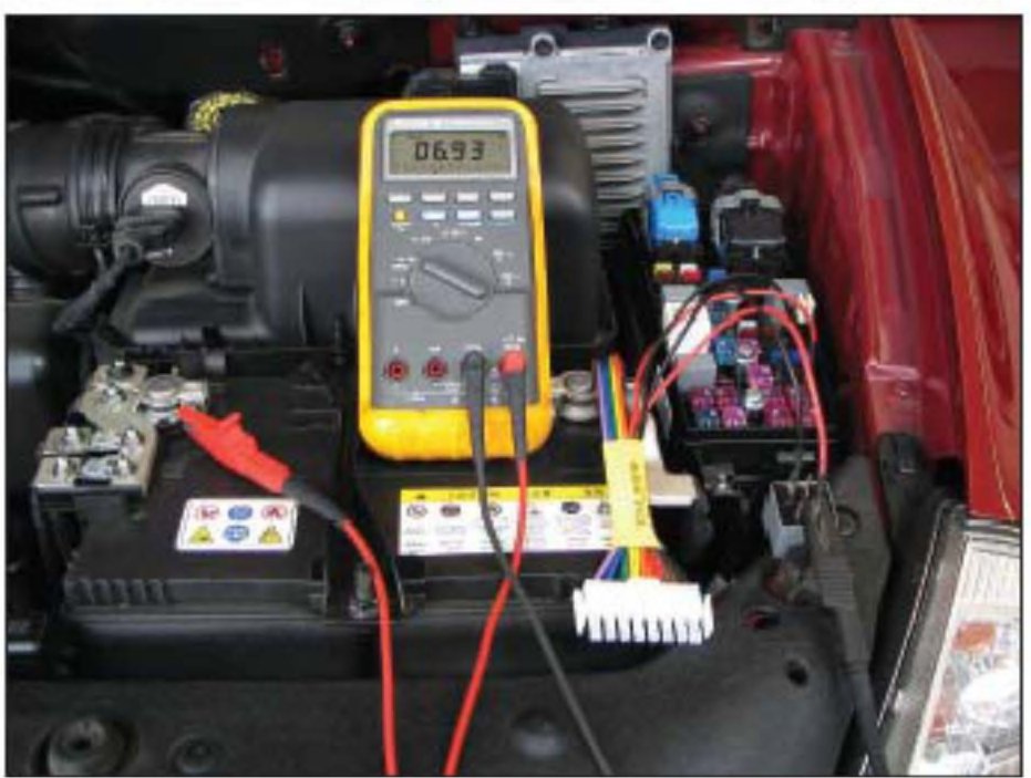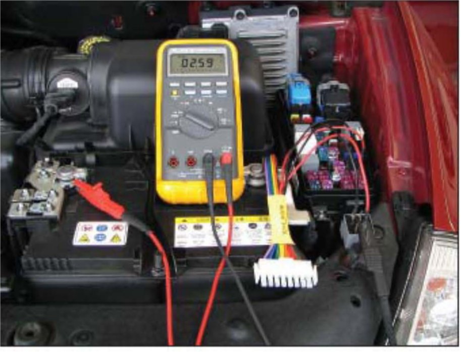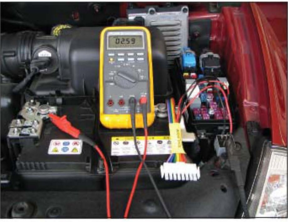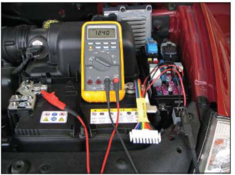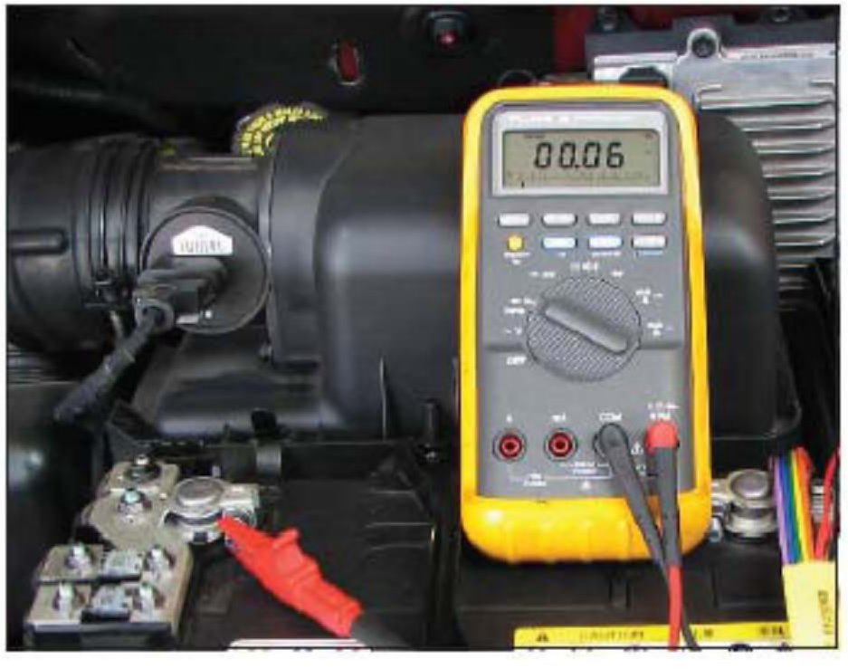 8. Connect (clip) the DVOM positive (red) lead to the battery positive terminal. The DVOM should now read battery voltage.