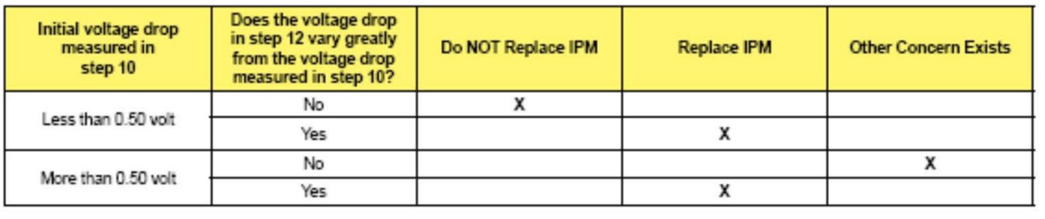 In this step only the Burglar Alarm Relay contacts are being moved. With the relay's contacts closed (STOP selected), if the measured voltage drop does NOT vary greatly, the IPM Burglar Alarm Relay is not defective. Instead, other sources of high resistance may exist. Based on your results use the table to determine if the Burglar Alarm Relay inside the IPM is defective or that yet another concern exists.