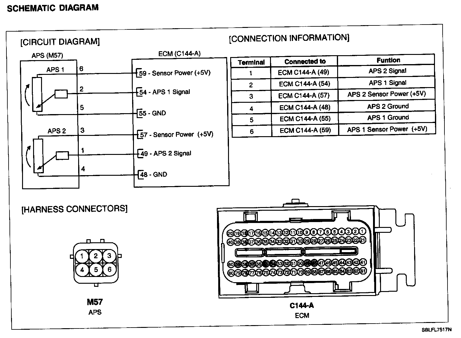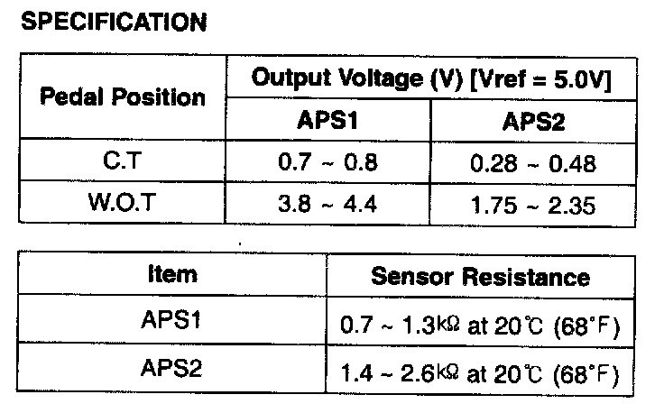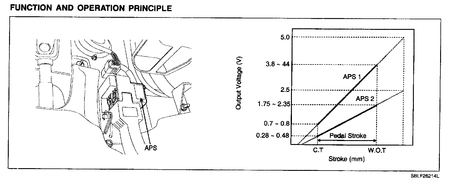 Accelerator Position Sensor (APS) is installed on the accelerator pedal module and detects the rotation angle of the accelerator pedal. The APS is one of the most important sensors in engine control system, so it consists of the two sensors which adapt individual sensor power and ground line. The second sensor monitors the first sensor and its output voltage is half of the first one. If the ratio of the sensor 1 and 2 is out of the range (approximately 1/2), the diagnostic system judges that it is abnormal.