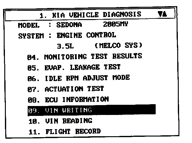 VIN PROGRAMMING PROCEDUREVIN (Vehicle Identification Number) is a number that has the vehicle's information (Maker, Vehicle Type, Vehicle Line/Series, Body Type, Engine Type, Transmission Type, Model Year, Plant Location and so forth. For more information, please refer to the group "GI" in this SERVICE MANUAL). When replacing an ECM, the VIN must be programmed in the ECM. If there is no VIN in ECM memory, the fault code (DTC P0630) is set.