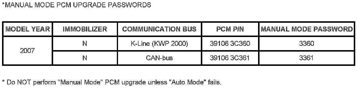 DO NOT attempt to perform a Manual Mode PCM upgrade unless Auto Mode fails. Always follow the instructions given on the GDS tool in either Auto or Manual mode. See table above for Manual Mode passwords.