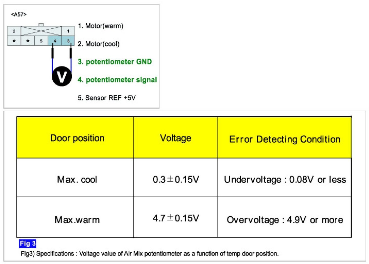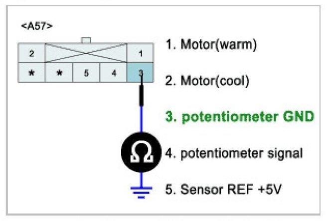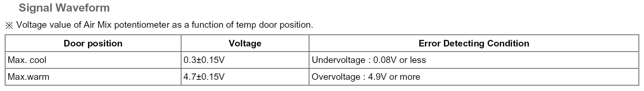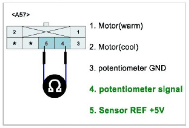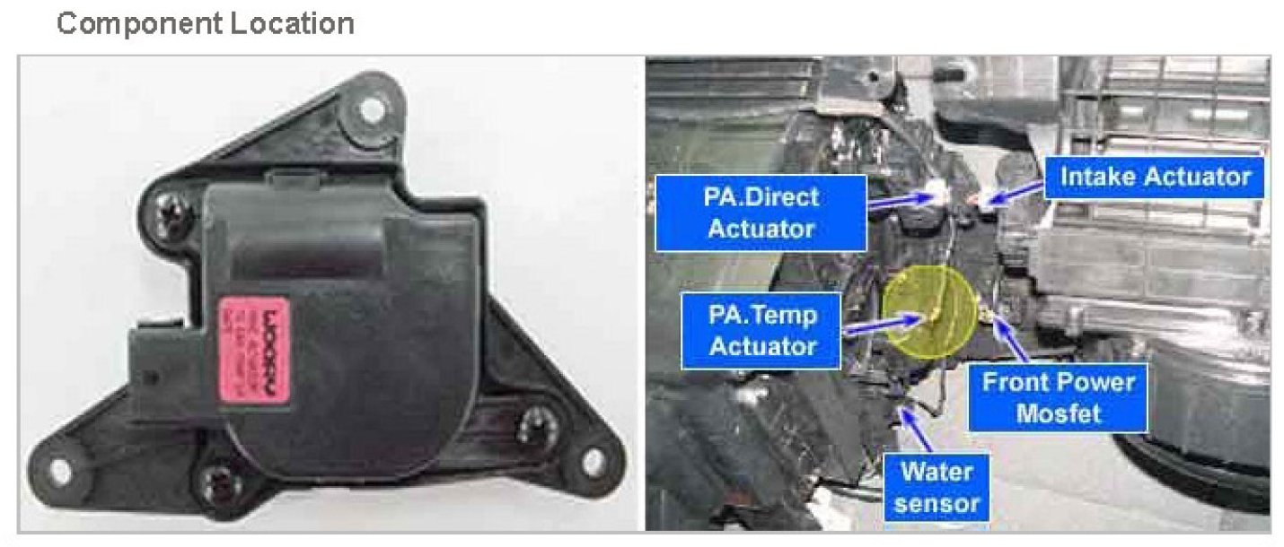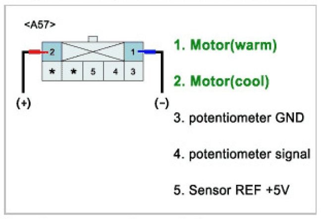 Temperature control actuator located at heater unit. It contains temp motor that changes temp door position and potentiometer that monitors position of temp door. Temperature control actuator regulates the temperature by the procedure as follows. Signal from control unit adjusts position of temp door by operating temp motor and then temperature will be regulated by the hot/cold air ratio decided by position of temp door. In operation, potentiometer delivers temp door position transformed into voltage value to A/C ECU.