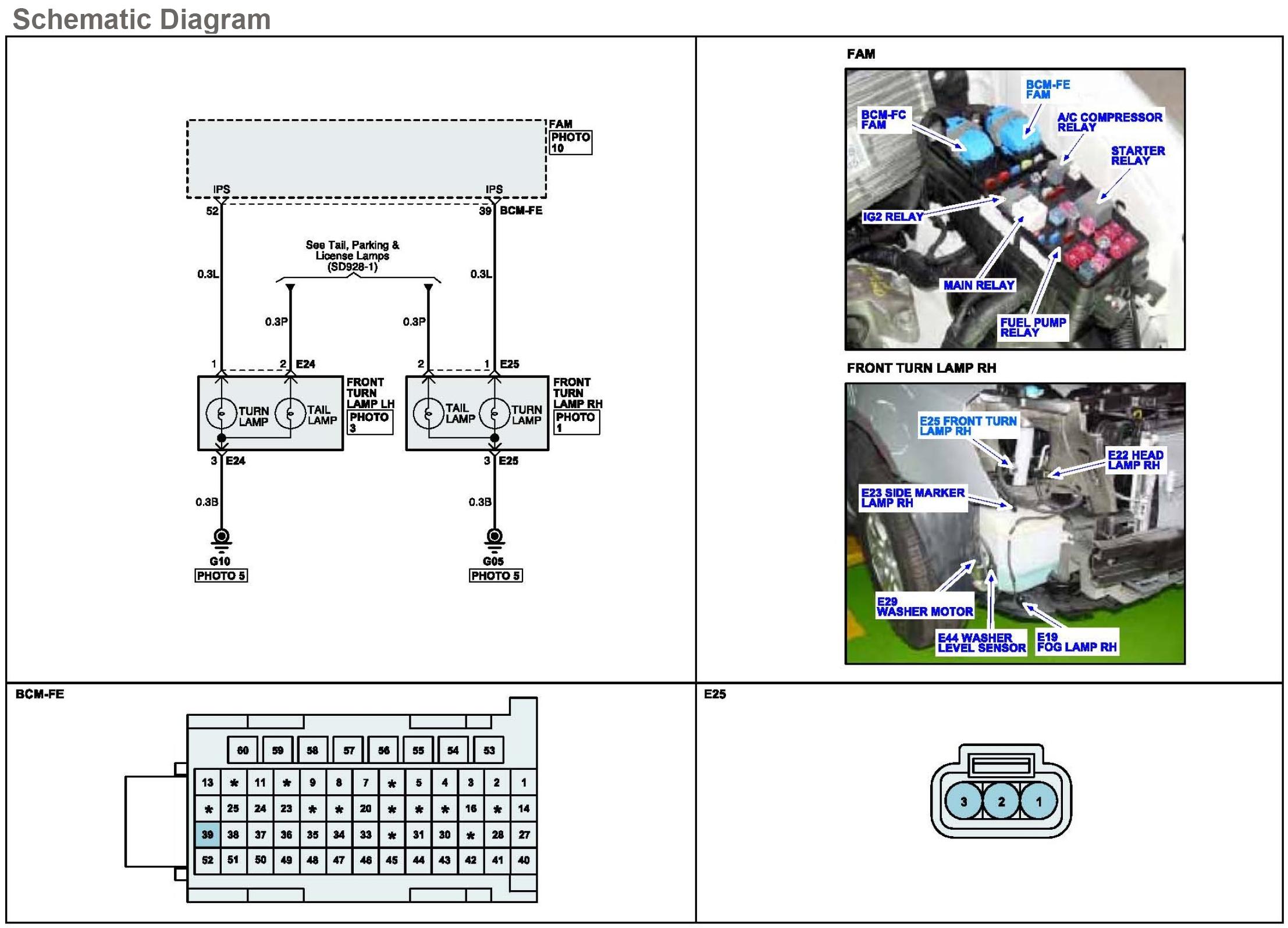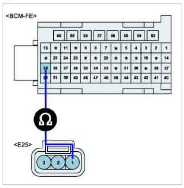 2. Measure the resistance between Right turn signal lamp power circuit of FAM (BCM-FE-39) and turn lamp (E25-1).