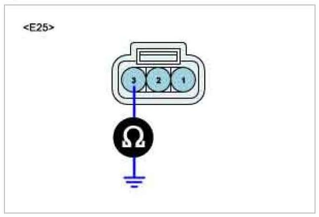 2. Measure the resistance between Right turn signal lamp ground circuit (E25-3) and chassis ground.