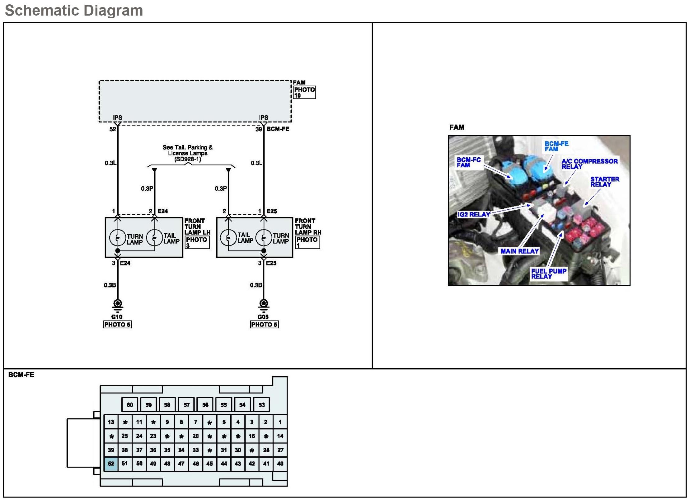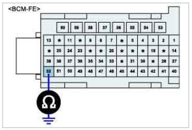 3. Measure the resistance between Left turn signal lamp power circuit of FAM (BCM-FE-52) and chassis ground.