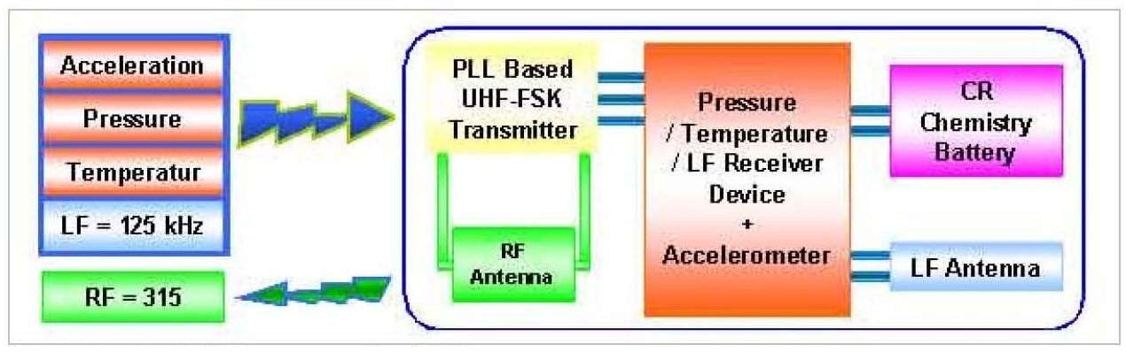 The WE sensor is equipped with a Radio Frequency (RF) transmitter circuit which is used to periodically broadcast information from inside the tire. All WE sensor units operate on the same RF channel frequency, and each broadcast message includes pressure and temperature data, a unique ID code, operating state data, status information, and digital error-detection data.