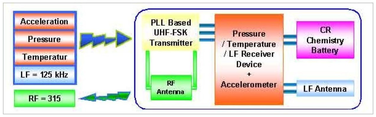 The WE sensor is equipped with a Radio Frequency (RF) transmitter circuit which is used to periodically broadcast information from inside the tire. All WE sensor units operate on the same RF channel frequency, and each broadcast message includes pressure and temperature data, a unique ID code, operating state data, status information, and digital error-detection data.