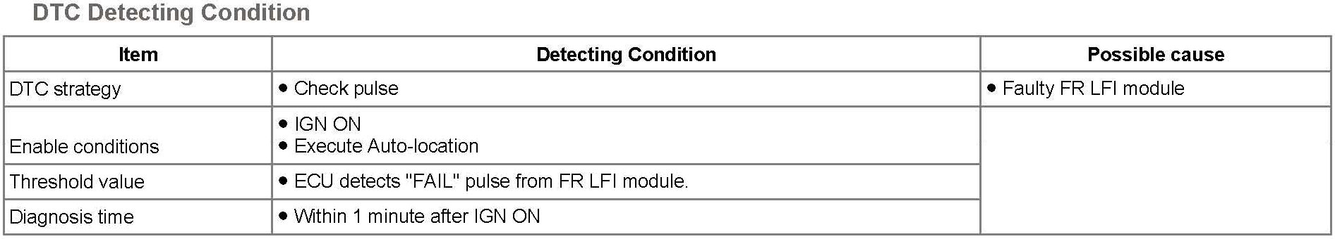 This DTC indicates that ECU detects "FAIL" pulse from Front Right LFI module. The most likely cause is LFI module failure.