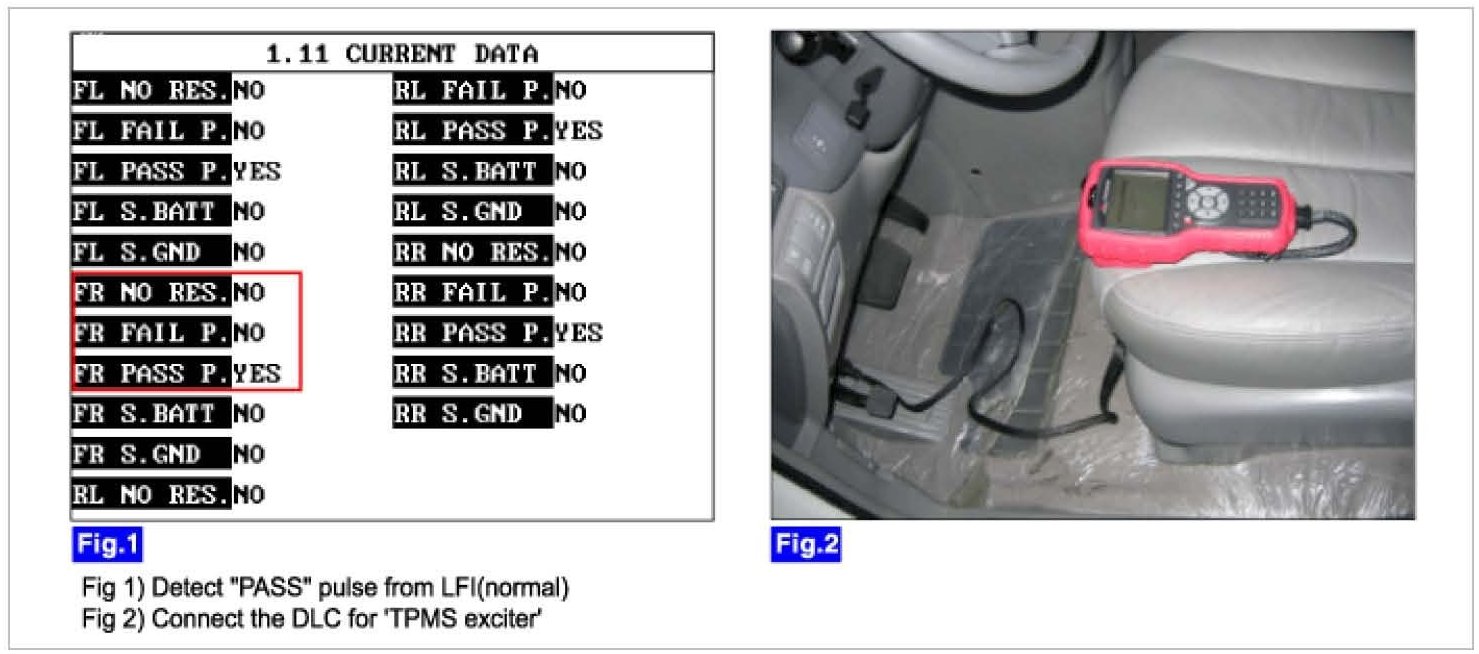 4. Monitor the parameters of 'Front Right' LFI on the 'TPMS exciter' or scantool.